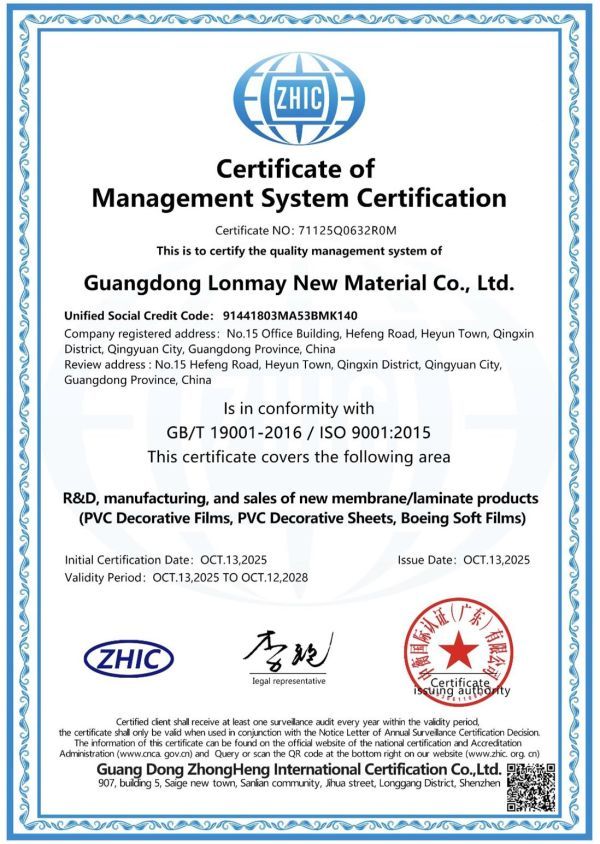 浪美装饰膜自成立以来,以引领行业高质量发展为己任,为了树立国产装饰膜的品质形象,对装饰膜品质标准进行了全面调整和优化。同时配备了高精度、高效率的印刷、贴合、涂布一站式专业生产线,建立了严格的内部品控标准。此次通过ISO 9001质量管理体系认证,进一步验证了浪美装饰膜从原材料采购、生产制造到市场销售的全流程质量管理能力。