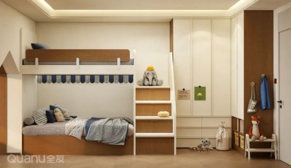 通过错位上下床实现空间分割,哥哥上铺与妹妹下铺分别从两侧进出,既满足睡眠需求,又保障了隐私。