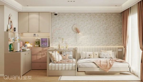 配置矮床+活动桌椅,留出充足游戏空间,让孩子安全探索世界。床边矮柜与专属收纳区培养自主整理习惯,玩具绘本各归其位。