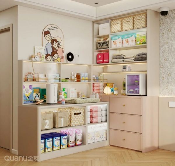 转角矮柜设置尿布台,后方浅柜收纳宝宝各种零碎用品,下方则是囤货区,纸尿裤、湿巾随用随取,贴心守护母婴日常。