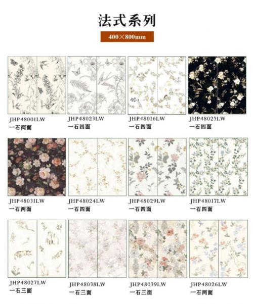 新产品包括:(1)子母配套砖新品,规格在4~6个配套规格,现拥有超100款子母配套花色;(2)艺术花砖新产品,涵盖复刻釉、柔抛、精雕、模具、干粒等工艺的400X800、600X1200、400X1200等规格艺术花砖;(3)超15款,中板配套新产品等。