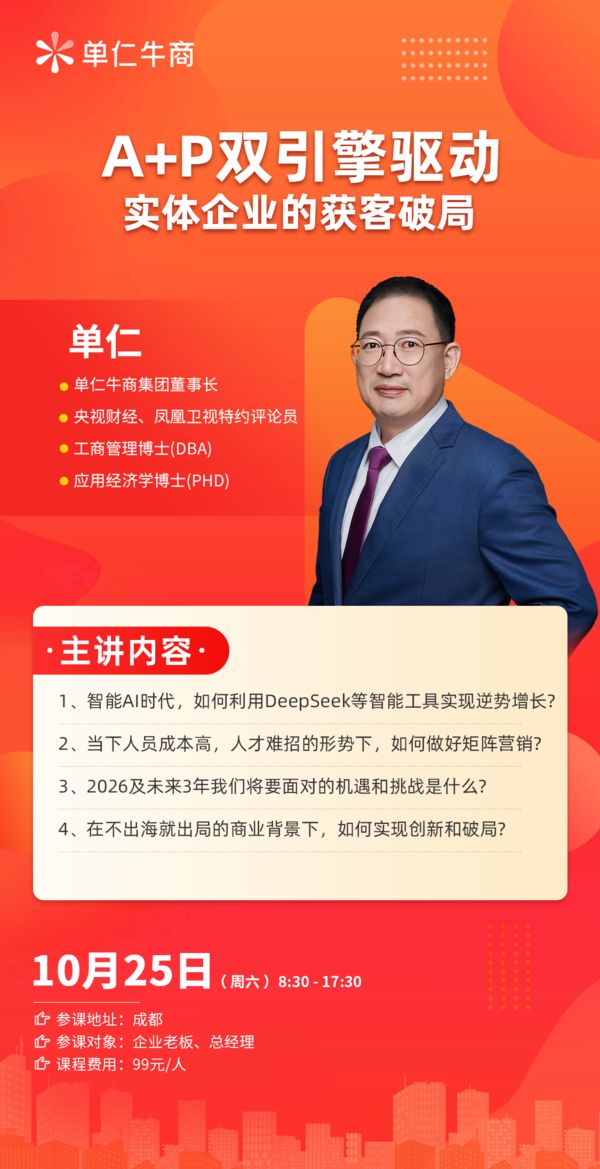 10月25日,成都见!听单仁牛商集团董事长单仁博士讲透:AI时代,实体企业如何实现获客破局