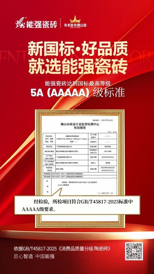 能强瓷砖凭借卓越的产品研发实力与领先的制造标准,率先通过《陶瓷砖》国家标准GB/T45817—2025的AAAAA级检测认证,入选 “2025中国陶瓷质造百强”荣誉榜单,以双项殊荣,彰显能强瓷砖的质造实力。