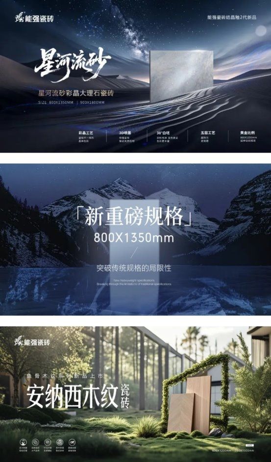 能强瓷砖始终坚持“人无我有、人有我优的创新理念,凭品质和创新引领着中国建陶行业的发展。2025 年重磅打造的「星河流砂」和极致理石53°珠光「云胧素月」,突破行业常规800×1350mm黄金规格,色彩丰富、质感细腻,艺术与实用兼具;更有创新珍珠绒工艺安纳西木纹砖,为家居空间带来全新视觉与审美体验,进一步彰显能强瓷砖创新实力与前瞻性。