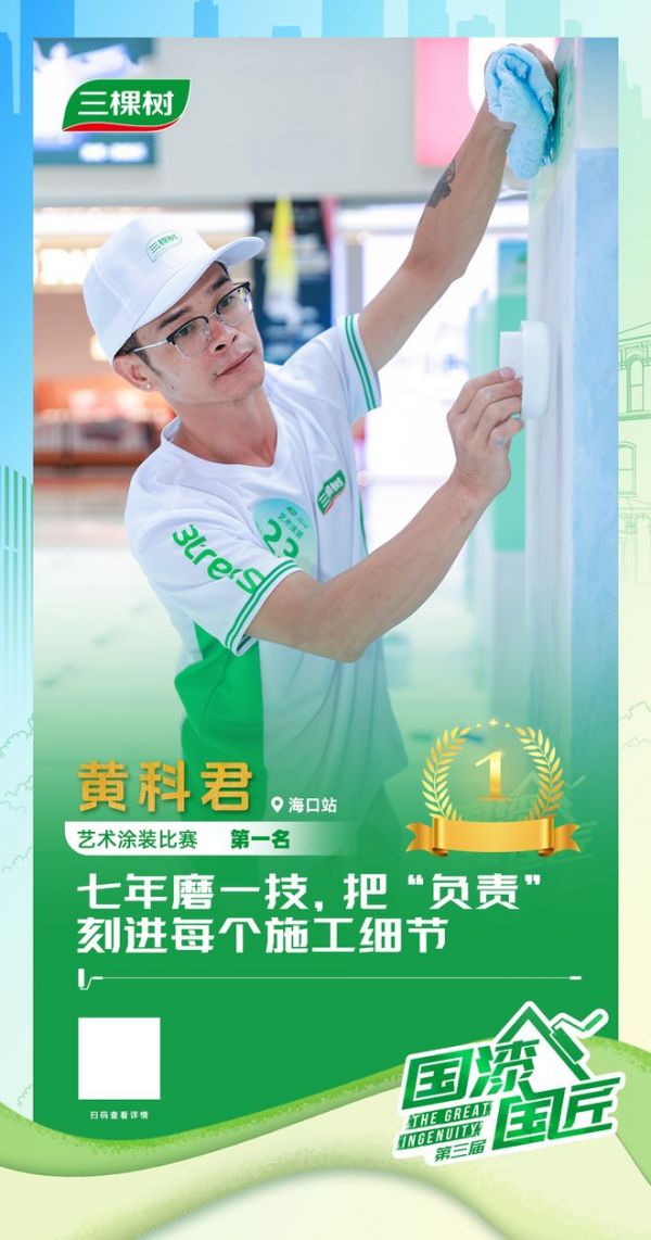 十月海口,暖湿的海风拂过骑楼老街的南洋窗棂。2025三棵树“国漆国匠”第三届全国建筑涂装职业技能大赛海口站刚刚落幕,此次艺术涂装赛道的金牌得主黄科君,他是一位入行7年、专注内墙艺术涂装的资深匠人。他最早活跃在广州、佛山家装涂装领域,他觉得涂料不仅是遮盖墙面的材料,更是业主审美表达的载体。在他心中,工匠精神就是把“负责”融入每一次施工,于细节中成就非凡。赛后,网易家居独家对话黄科君,听他讲述与艺术涂料的不解之缘,以及刻进施工细节里的专注与担当。