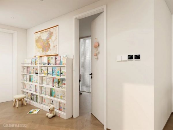 过道尽头做薄柜+挡杆开放式设计,专门展示绘本,增加书籍可见度,激发孩子的阅读欲望。