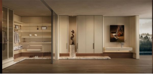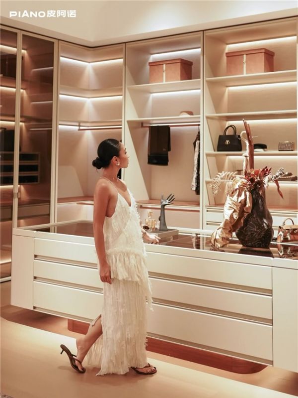 在卧室这一 “休憩核心区”,皮阿诺「峪」系列采用墙柜一体设计,圆弧墙板取意山川的自然弧度,打破传统方正空间的生硬感,搭配铝合金饰条的轻奢点缀,营造出柔和静谧的安眠氛围。特色内嵌式拉手融入门板,线条简洁流畅,睡前整理衣物时无需担心磕碰,指尖触碰的顺滑感进一步舒缓身心。