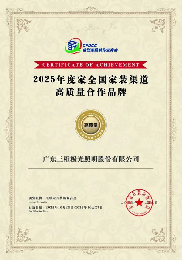 2025年10月28日,在遵义举办的“2025年度家装行业优秀企业高质量发展大会暨品质交付优秀企业发布会”上,三雄极光凭借其卓越的产品实力与行业影响力,将“2025年度全国家装行业品质交付企业优秀合作品牌” 与 “2025年度全国家装渠道高质量合作品牌” 两项大奖收入囊中。这份荣誉,不仅是行业对三雄极光产品品质的认可,更是对其“全屋光健康”战略及卓越交付能力的高度肯定。
