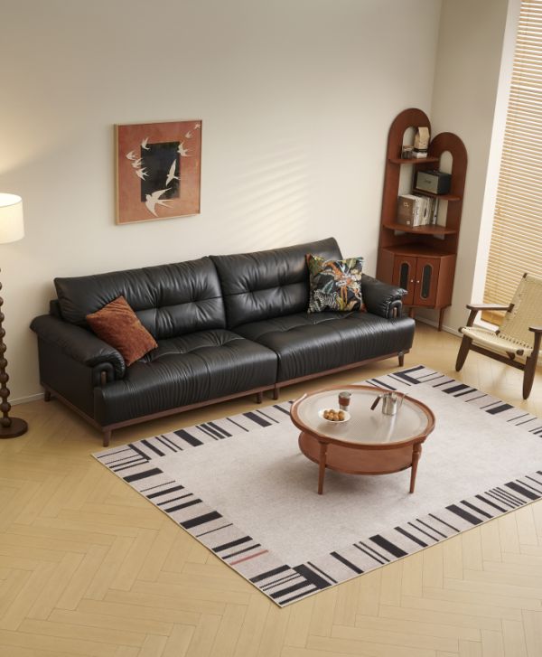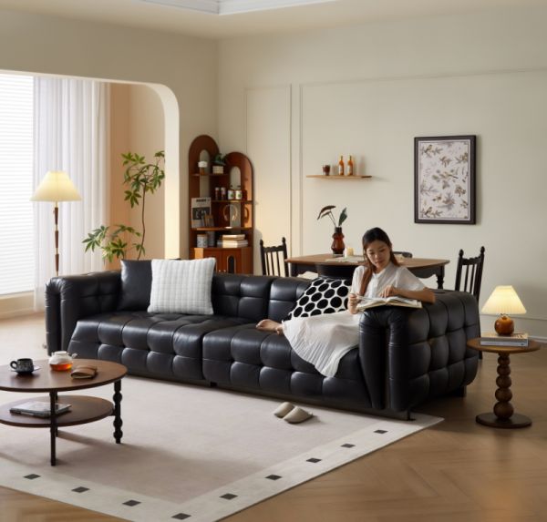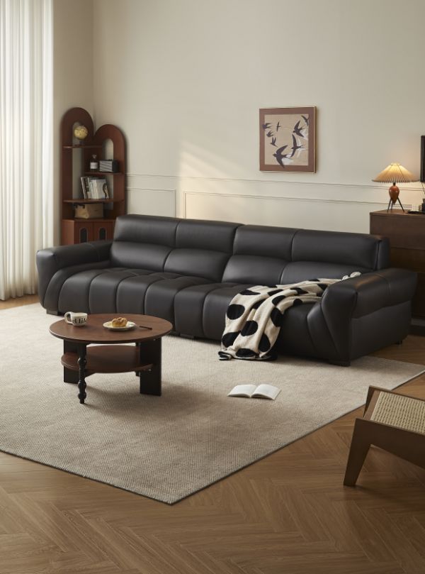 复古黑色调搭配饱满座包,如琴键般静谧舒适,松弛感自然流露。1.5mm进口头层牛皮,色泽持久,柔韧耐用。分段式靠包设计,精准承托头颈腰背,倚靠更舒适。37cm加宽扶手,便于置物与搭手。座包、靠包与扶手填充三层海绵,柔弹释压,倚靠更放松。