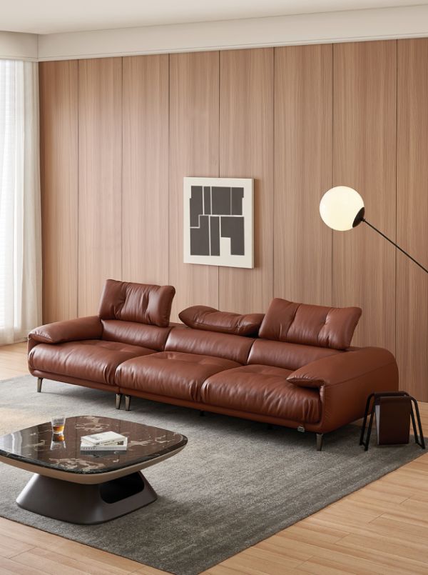 肉桂红棕色调,自带高级美感,廓形干练有型。1.8mm进口头层牛皮,天然皮革纹理,柔韧有肉感,亲肤透气不黏腻。沙发头枕灵活可调,支持0-90°多档位及左右弯折,适应不同身高与坐姿需求。内折扶手填充生态鹅毛与高弹棉,饱满柔软,可靠可枕,舒适加倍。
