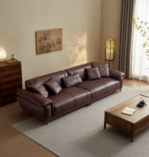 沉稳枣褐色大气包容,搭配历经时光打磨的实木框架,简约中见雅致。进口头层牛皮,荔枝纹细腻美观,提升客厅整体质感。挺括靠包与腰枕贴合身体曲线,倚靠时舒腰挺背。77cm加宽座深,坐躺皆自在。藤编纹理点缀外观,丰富层次,更添东方韵味。