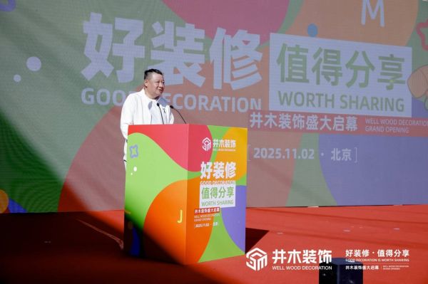 井木装饰董事长张轶登台,对到场的所有来宾表示衷心感谢,并深入阐述了品牌的核心理念。“感谢每一位选择在今天与我们共同开启未来的朋友。井木的诞生,源于我们对当下装修市场痛点的深刻洞察,以及对于‘好装修应该是什么样子’的重新思考。”他动情地说道,“我们不做信息的垄断者,而是做知识的普及者;我们不做方案的强硬推销者,而是做需求的贴心满足者。我们的‘模块化交付,环扣作业’体系,确保了专业人干专业事,让设计、施工、采购、安装像精密钟表一样无缝衔接。而每一位客户,都将拥有一位专属的‘服务总管’,进行一对一的全程沟通与协调。我们的目标只有一个:让装修过程变得透明、高效,让结果超越期待,最终让每一位客户都愿意主动分享他们的装修故事!”