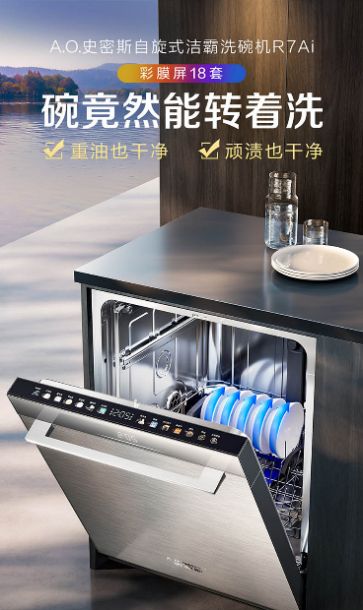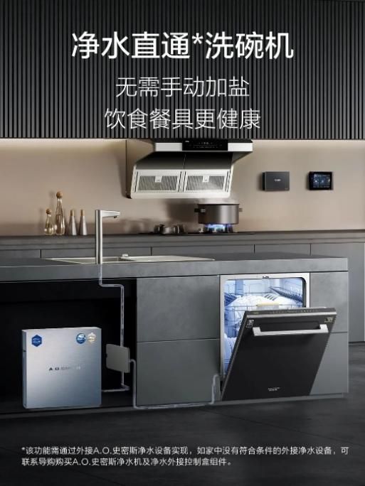 在AI-LiNK智慧「瀞」厨房里,可以通过AI-LiNK智慧中枢体验全场景的智慧联动带来的丝滑体验。净水器连通了整个厨房,净水直连洗碗机和蒸烤箱。王勉一边预约洗碗机工作,一边感叹:“用自来水时,洗碗机还得加软水盐,现在不需要了。”A.O.史密斯洗碗机通过净水器直供净水,避免有害物质残留,再配合自旋式洁霸黑科技,能实现360度无死角清洗。