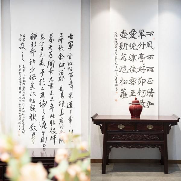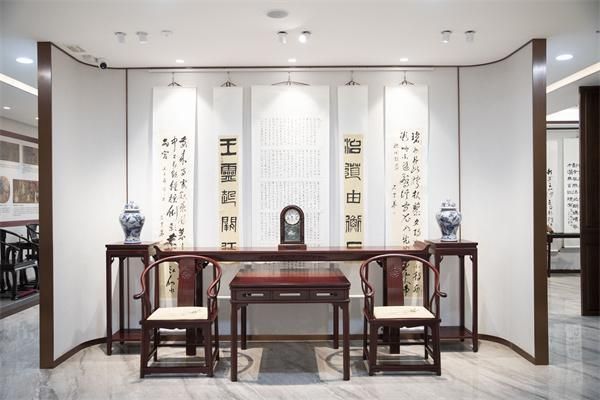 一幅苍劲的隶书,与一张雕工精湛的明式书案相得益彰;一行灵动的行草,在一组典雅大气的红木沙发映衬下,更显飘逸。二者并非简单的陈列,而是相辅相成,共同构筑了一个充满东方哲思的审美空间,让每一位到场嘉宾直观地感受到:真正的中国式优雅,是贯通于所有艺术形式之中的灵魂共鸣。