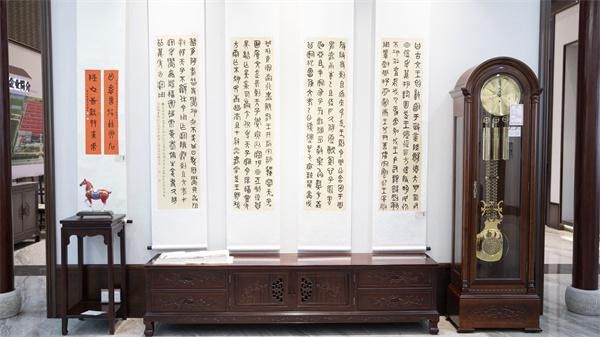 于建华师生们的书法作品,或悬挂于素壁,或静置于红木案几之上。笔走龙蛇的意气与巧夺天工红木精品的温润厚重,在此刻达成了完美的默契。