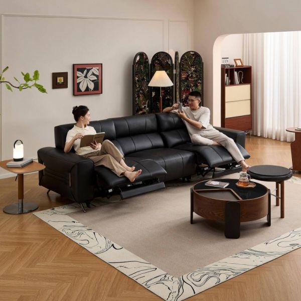 绅士真皮沙发,外观方正线条简练,进口头层牛皮大面积覆盖,质地细腻温润,柔韧耐磨。双电动功能位110°-160°无极调控,精准贴合人体曲线,给予全方位的饱满支撑。0靠墙设计,有效节约空间,同时避免小物掉落。信封造型扶手高度适宜,倚靠搭放皆宜。