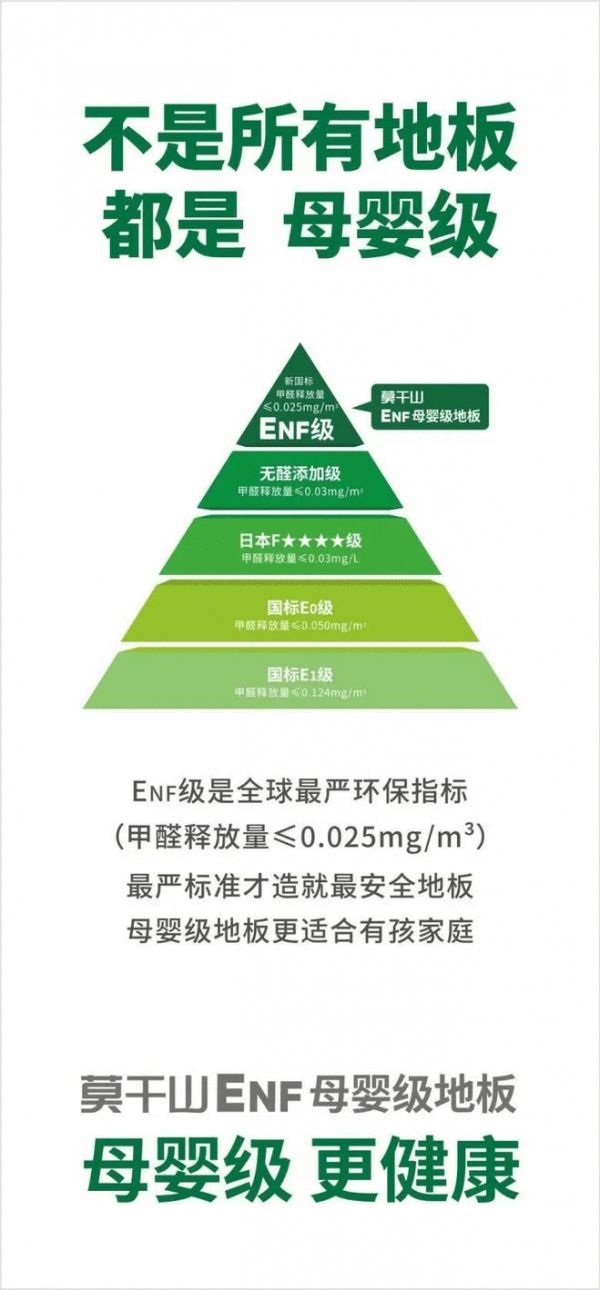 2022年,在“再一次定义环保”莫干山品牌战略发布会上,莫干山地板的品牌定位进行了全新升级——ENF母婴级地板。积极抢占ENF级地板新品类新赛道,莫干山地板致力于实现“占领更环保、占领母婴级、占领更健康”的战略目标。莫干山ENF母婴级地板位于环保标准金字塔新塔尖,甲醛释放量、重金属含量、有机物释放量都严苛控制,整体环保内核更全面、环保标准更严苛,让行业高配成为健康家的标配。