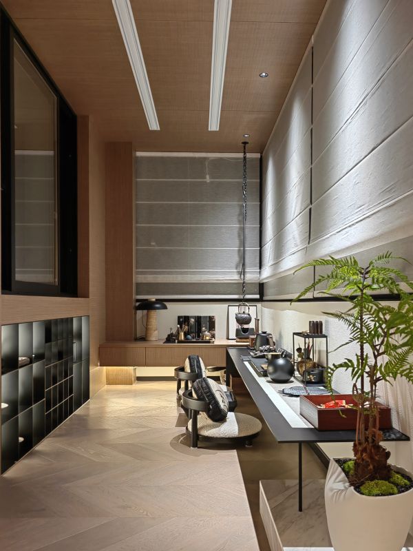 茶室,浓缩了东方美学的神韵。木质地板的人字拼如岁月的纹路,长桌之上,茶具错落,一株蕨类植物绿意盎然,似在呼应着“茶禅一味”的古老哲思。吊灯的设计别具匠心,金属的链条与古朴的茶器对话,在光影明暗间,把东方的含蓄与现代的简约揉成了一杯回甘的清茶。