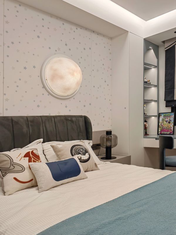 把宇宙的浪漫与探索的勇气,都装进这间属于他的小天地。墙面上的星子如碎钻散落,一轮“圆月”悬于床头,为他的梦铺就星际航线。航天元素的抱枕鲜活灵动,似在邀约他共赴一场太空漫游。书架是知识的宇宙空间站,绘本与摆件在灯带的光晕里,藏着无数待解锁的冒险故事;那顶蓝黄相间的头盔,更是随时准备载着他驶向户外的未知风景。这里是他的成长堡垒,盛满对宇宙的好奇、对世界的敢闯,让每一次休憩都成为蓄力,每一次凝望都指向远方,在星光与书香的陪伴中,长成独当一面的小小探险家。