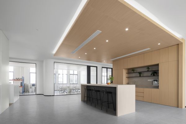 独立的抛中吧台,沿用了茶水柜灰色层板的材质和仿石纹岩板的大包围台面,既满足员工茶水补给需求,又提供了轻松的交流场景,缓解工作压力。整体设计通过色彩与材质的平衡,实现了功能性与美学性的统一。白色的通透、灰色的稳重与原木的温润相互融合,既符合现代办公对高效简洁的需求,又通过自然元素的植入,让空间更具亲和力,为员工打造出一个兼具专业感与归属感的办公场所。