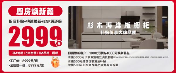 (1)焕新套餐:“3M地柜+3M台面+1M吊柜”标准套餐,全国统一价8999元,工厂价6999元,活动价直接降至2999元/套!采用ENF级顶s级环保板材,快速安装,即刻焕新。