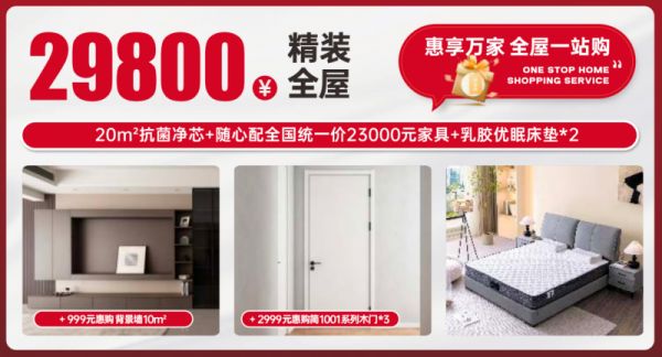 (1)核心套餐:20㎡抗菌净芯板 + 随心配全国统一价2300元家具+ 2张乳胶优眠床垫,全国统一价23000元。