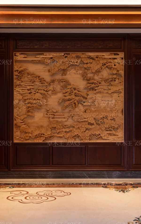 卓木王原创设计、特别定制的巨幅山水木雕艺术品,取整块椴木独板,将业主庭院气象1:1融入其中。近景松柏苍劲,中景楼阁掩映,舟楫轻移,远景峰峦逶迤。万象山河间,凤引龙舟,相偕共进。