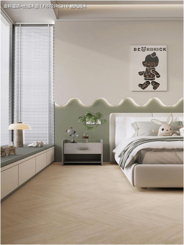 ▪️ 温馨感来自柔光:这款木纹砖拥有30°丝绒柔光质感,光线透过百叶帘洒下,在砖面上形成温柔光晕,为儿童房提供了恰到好处的温馨采光。