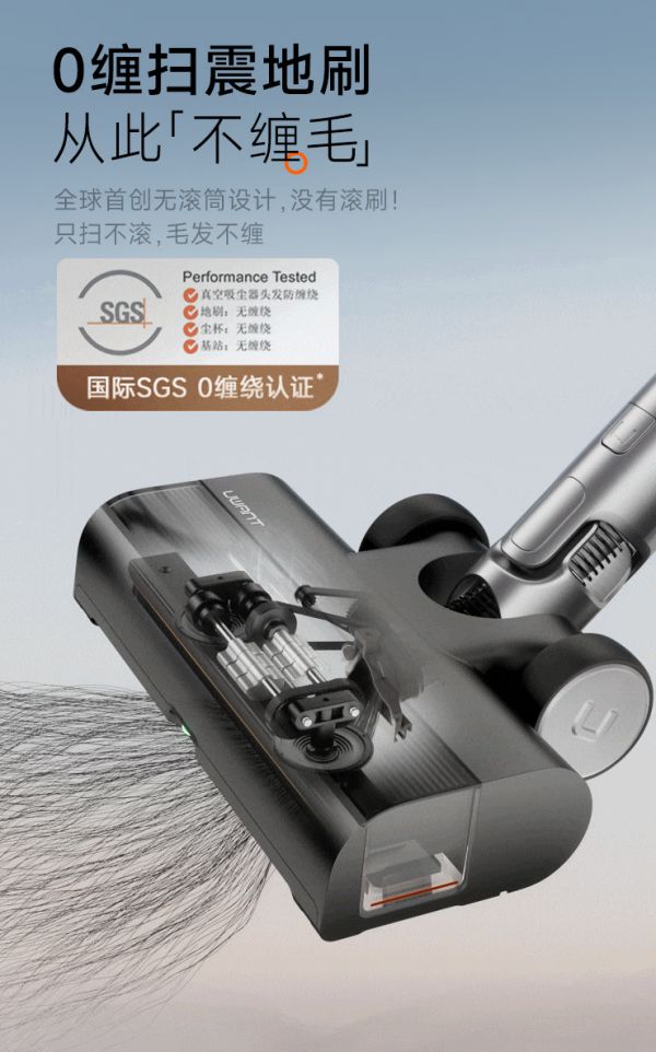 友望扫帚仿生设计:0 缠扫震地刷应用扫帚仿生学,无滚筒结构从源头杜绝缠绕 —— 地刷底部的全地形软质刮板,就像扫把的刷毛一样轻柔扫过地毯表面,不旋转、不缠绕,同时配合高频扫震运动,只吸发不缠发;即使连续清洁 30 分钟长毛地毯,地刷依然干净无残留,无需任何手动清理。经 SGS 权威认证,50cm长的头发 0 缠绕率达 100%,彻底告别戴森 “吸完撕缠发” 的痛苦。