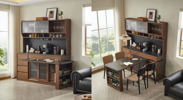 集餐桌、餐边柜、吧台功能于一体,胡桃木色系与黑色碰撞出美感,营造出兼具原木温润与复古格调的餐厅氛围。L型搭台与柜体流畅衔接,可伸缩旋转,轻松适配日常用餐、休闲娱乐等多种场景。黑色石纹钢化台面,耐磨耐刮易清洁。10大多元收纳区,各类器具各归其位,生活更加从容有序。