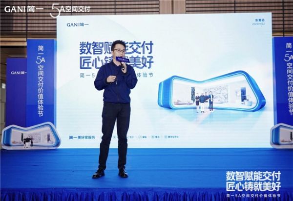 在核心发布环节,简一数字化成品交付负责人 黄汉秋 为现场嘉宾深入解析5A空间交付的内在逻辑。他从产品的严苛筛选讲起,延伸到密缝铺贴的标准化施工流程,再到覆盖设计、施工、验收的全周期透明化管理,系统性地展示了如何通过标准化的产品体系与服务流程,为家装过程中的每个环节提供确定性保障,让"装修不再开盲盒"的承诺真正落到实处。