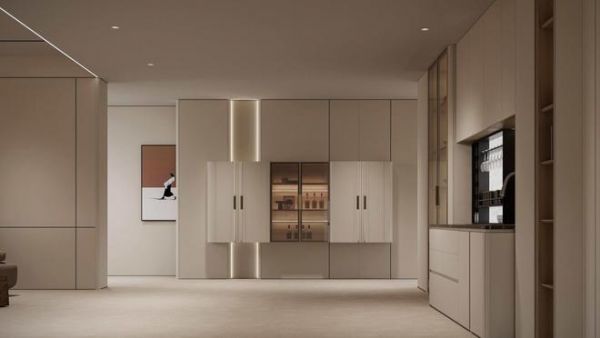 流畅的动线让冲泡饮品、准备轻食成为一种从容的享受,无论是忙碌的日常还是悠闲的周末,都能在这里找到最舒适的节奏。餐边柜集展示、收纳与操作于一身。封闭高柜内部精细分区,轻松收纳生活琐碎;悬浮展示层板搭配内嵌暖光,让心爱的杯盏藏品如艺术品般优雅呈现,成为家中一道动人的风景线。