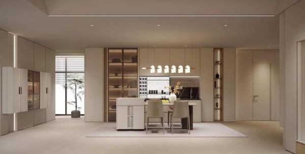 打破了传统隔阂,开阔的布局能与家人随时互动、自在聊天,让做饭的人不再孤单,餐边柜极简的立面将所有功能巧妙收纳于无形,恰到好处的内置光源,在需要时温柔点亮备餐区与桌面,让清晨的第一杯咖啡或晚间的家庭聚餐,都沉浸于静谧而温馨的氛围中。