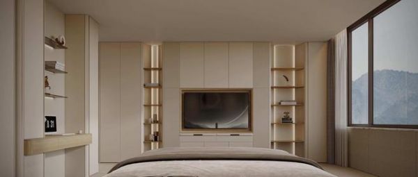 电视背景墙延续了嵌入式整合设计理念,电视被木制框架温柔包裹,与墙体自然融合。左右延伸的悬浮开放格既可摆放书籍饰品,也保持了视觉的连贯与轻盈。这一设计不仅满足了日常观影与收纳需求,更以简洁有序的立面语言,延续了卧室整体的静谧与和谐。