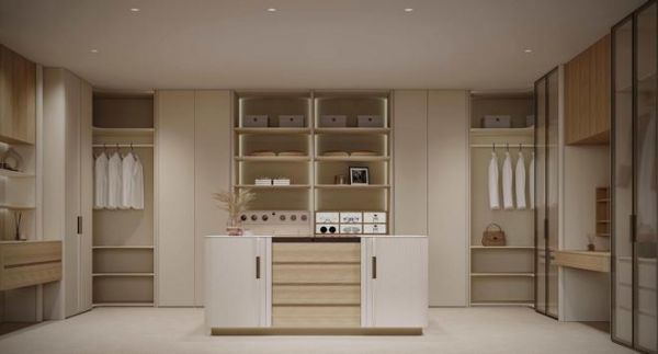6.高定衣帽间 | 优雅秩序与从容穿搭的专属秀场 「静谧时光」整家系列衣帽间以中央岛台为核心,形成一个流畅的“洄游”动线,挑选、搭配、收纳,一系列动作如行云流水,自在流动。圆弧转角温柔过渡,避免了磕碰可能。内部设计更是深思熟虑,人性化收纳系统为穿过的“次净衣”和干净衣物分别安排了位置。