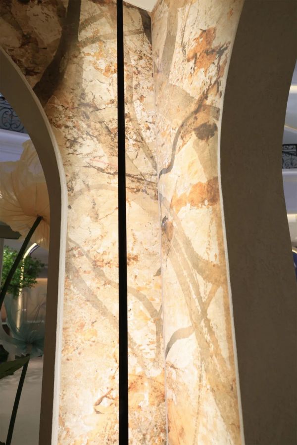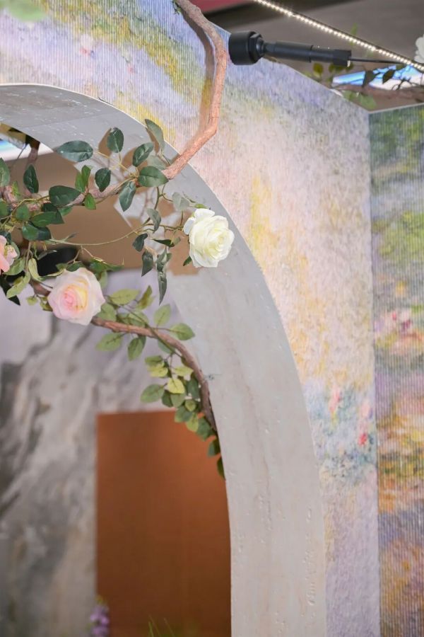 事实上,展厅内的打卡点远不止于此。如“莫奈花境”展示区,设计师充分理解了路易斯·康的建筑理念,融合画家莫奈的色彩美学,运用大岩板、马赛克、艺术岩板、软瓷、涂料等多种材料,营造出春、夏、秋、冬四时情境,风格独具。极致体现设计、材料和工艺的相得益彰。