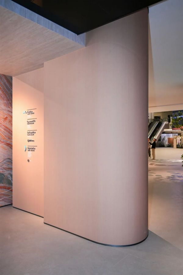 例如,在展厅入口大堂,前台立面、前台环绕的圆柱体包覆材料,以及天花板呈现镜面效果的材料,均来自新明珠绿材。这些产品凸显出新明珠绿材轻薄、随物赋形、应用范围广等优势。