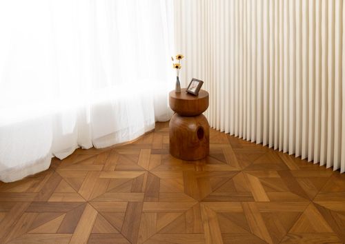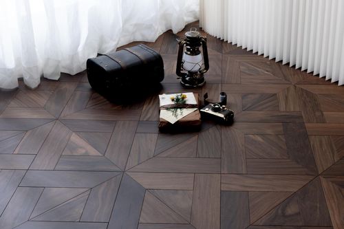 本品设计开创了实木地板美学的新境界:甄选材质优异、材性重硬的黑黄蕊木,配合原创内外全锁扣工艺,将巧工名材美妙结合,从而诞生出这款气质端方的艺术拼花产品,以此寓意长安未央、吉祥传世的美好祝福