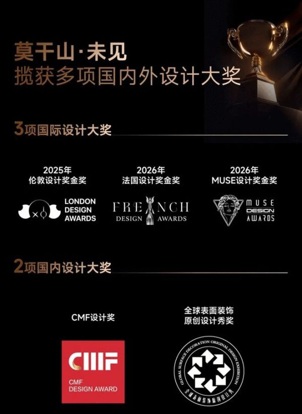 这份对美学的极致追求,让“未见”一举斩获2025伦敦设计奖金奖、2026法国设计奖金奖、2026MUSE设计奖金奖、CMF设计奖、全球表面装饰原创设计秀奖五项国内外权威大奖,用国际认可证明:中国品牌的美学表达,足以定义全球高端标准。