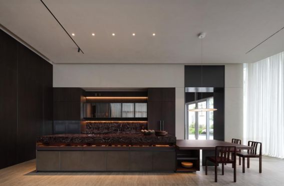 用餐区摆设Ignazio Gardella设计的Blevio餐桌,搭配Janet餐椅,将宾客视线自然引导至厨房区域。Ratio厨房配备黑色火山岩与星云钢面板,配以Technical Column 2.0高柜,与Foster+Partners设计的标志性Arc餐桌及Tobia Scarpa设计的MHC.3 Miss餐椅相得益彰。