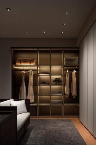 移步宽敞的衣柜区域,配备Gliss Master衣帽系统的奢雅家具塑就醒目焦点,诠释Molteni&C卧室系列精髓;另搭配Margou扶手椅与Hector镜子,以考究细节升华主卧衣帽间的非凡格调。
