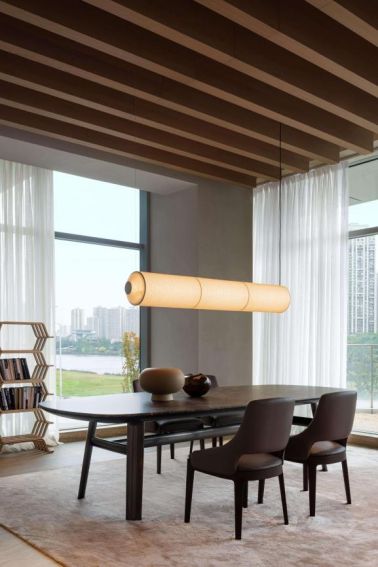 移步至顶层空间,两处风格迥异的起居区映入眼帘,分别陈设Vincent Van Duysen设计的Paul沙发与Octave沙发。开阔空间内摆设Rodolfo Dordoni设计的Oldford餐桌与Devon餐椅。Living Box系统将此区域与陈设Paul沙发的休闲起居区巧妙分隔。包覆感十足的柔软圆润Elain扶手椅搭配Aster咖啡桌,与Ron Gilard设计的圆形Pannacotta咖啡桌及造型规整的45°咖啡桌构成层次丰富的组合。