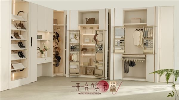 立享·扉纳阁凭借立式扩容设计向上开发空间,搭配可调节内部配件,实现衣柜、玄关、梳妆区、兴趣角全屋多场景适配。