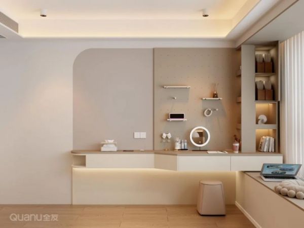 台面衔接开放式储物格,并结合墙面洞洞板系统,自由调节置物架与挂钩,巧妙实现梳妆、办公与收纳的三重需求。