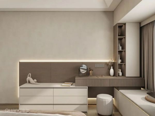 采用六斗柜分类收纳衣物配饰,衔接的悬浮台面延伸出梳妆区,再搭配内置灯带的开放格,巧妙为小户型实现视觉扩容。