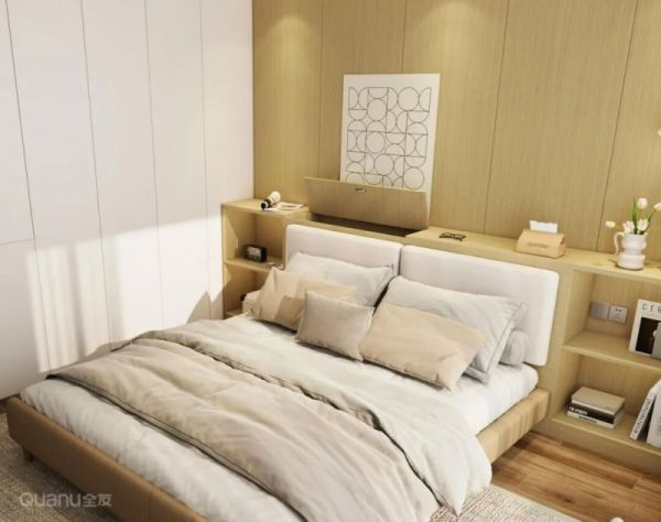 在床头配置储物柜,延伸出的开放格作床头柜,维持睡眠区舒适度的同时,大幅提升卧室的储物容量。