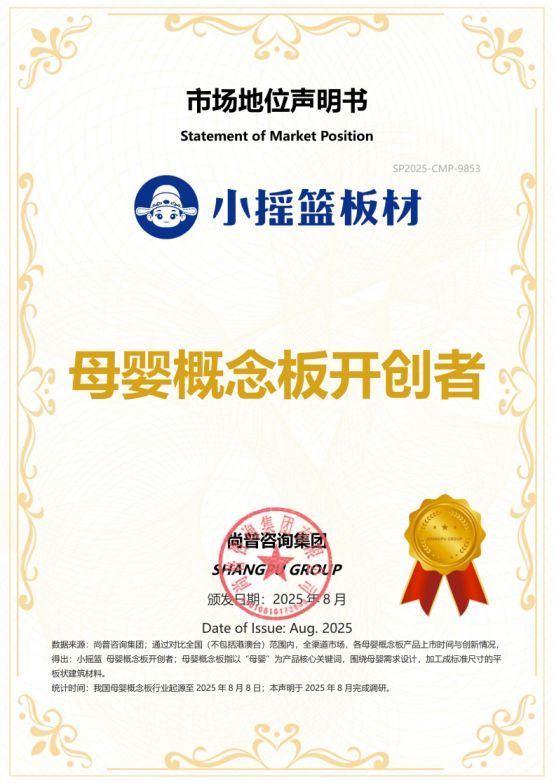 2025年8月,尚普咨询集团向小摇篮颁发市场地位声明书。小摇篮荣获【小摇篮 母婴概念板开创者】【小摇篮 母婴概念实木板全国销量第一】【小摇篮 母婴健康板全国销量领先】三项市场地位声明,标志着其在板材行业的标杆地位及消费者的高度信赖。