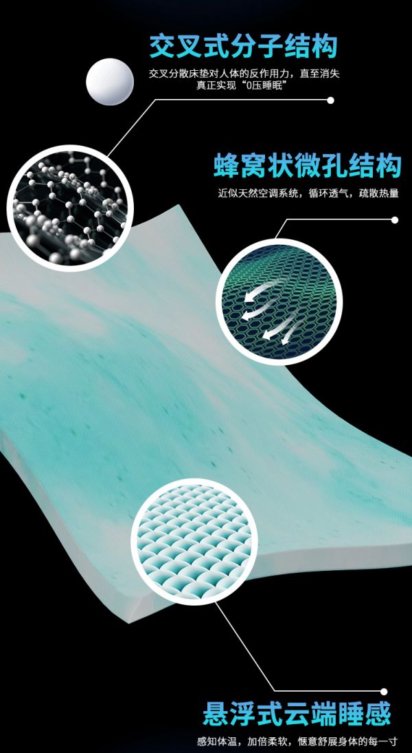 云感棉—穗宝采用云感棉核心填充,其独特交叉式分子结构,能精准捕捉身体与床垫的接触点,将床垫对人体的反作用力层层交叉分散、逐步消解至近零,真正实现“0压睡眠”。同时它的蜂窝状微孔结构近似天然空调系统,循环透气,疏散热量。质感上,如同卧云端的悬浮式睡感,十分柔软。它的支撑力变化幅度远低于普通棉,穗宝用80000次压缩测试数据清晰印证了其长期使用不易塌陷、保持形态稳定的耐用特性。