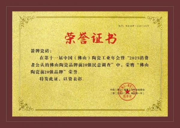 箭牌瓷砖凭借卓越的品牌口碑、过硬的产品品质与广泛的市场影响力,成功荣膺2025消费者公认佛山陶瓷品牌民意调查“佛山陶瓷前20强品牌”大奖。这份权威认证不仅是一项荣誉,更是广大消费者与行业专家对箭牌瓷砖的深度信赖与高度认可。