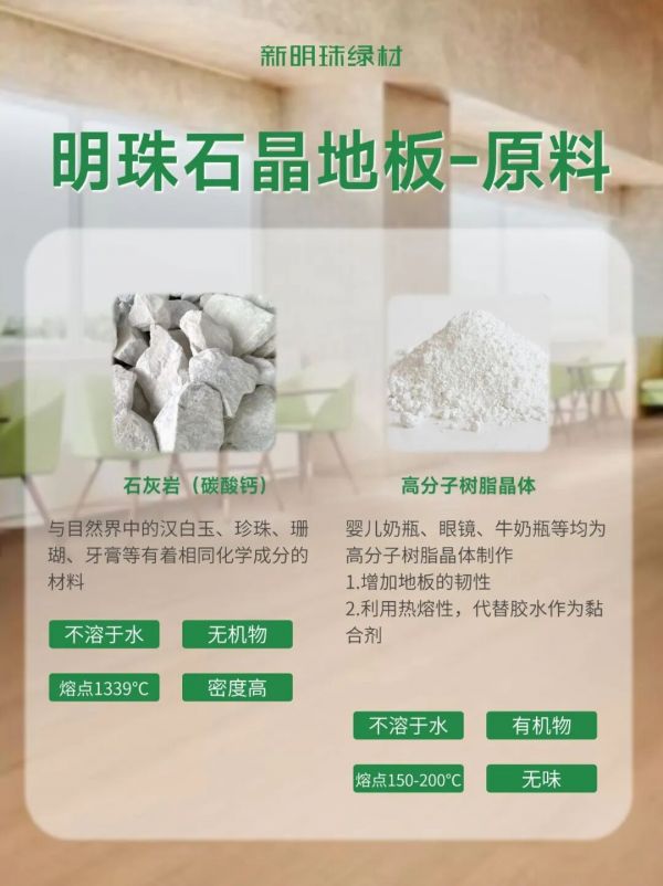石晶地板作为一种新型环保材料,由天然石灰岩矿石粉、高分子树脂粉为主要材料复合而成。新明珠绿材通过独特工艺,既保留了自然材质的质感,又拥有了超越传统的性能。